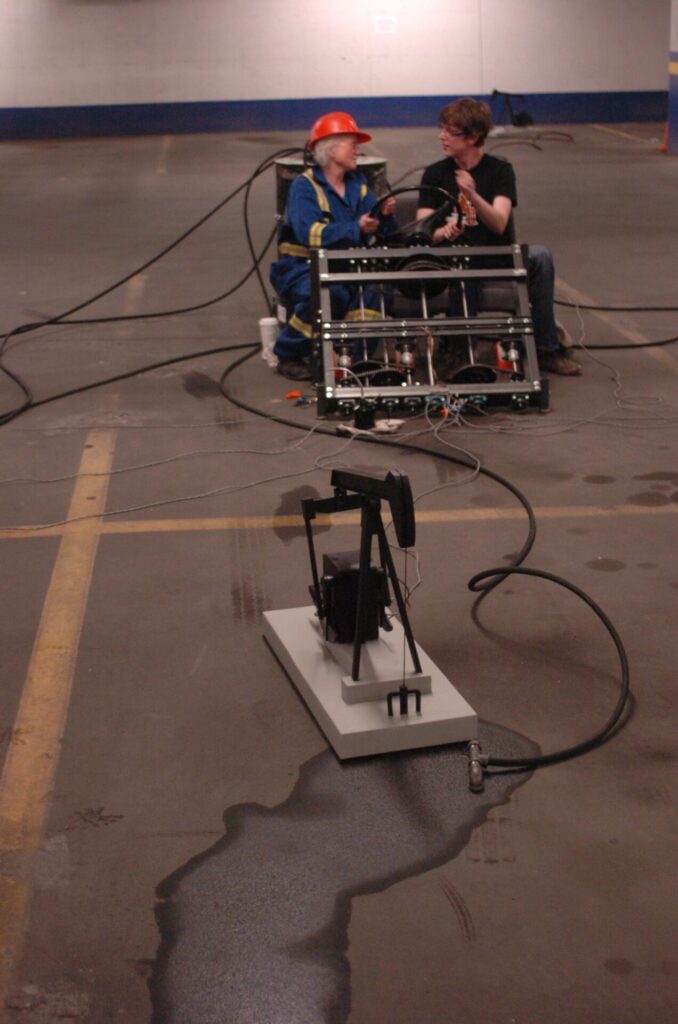 The premise for the performance was that I am searching for oil under every oil leak and oil stain that I find in a parking lot. I erected miniature oilrigs on the stains that I found and tried to extract oil from them. In the back of my small car skeleton, I had an empty 45-gallon oil drum and attempted to fill it from the oil that had leaked out of cars.