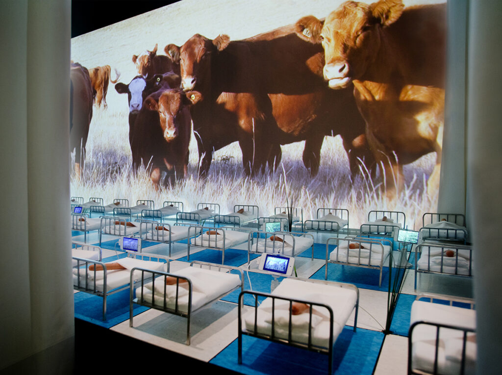 Tender was a hospital for hot dogs that were physically or psychologically injured. After I had exhibited my installation, The Lion’s Share, where hot dogs were hunted and eaten in the diner. I was focusing on processes of industrial food production facilities that risk the quality of life of the animals being slaughtered. I wanted to offer an opportunity to imagine the possibility of hot dogs healing and being reconstituted into cows and then released back into the prairie to live a full life.